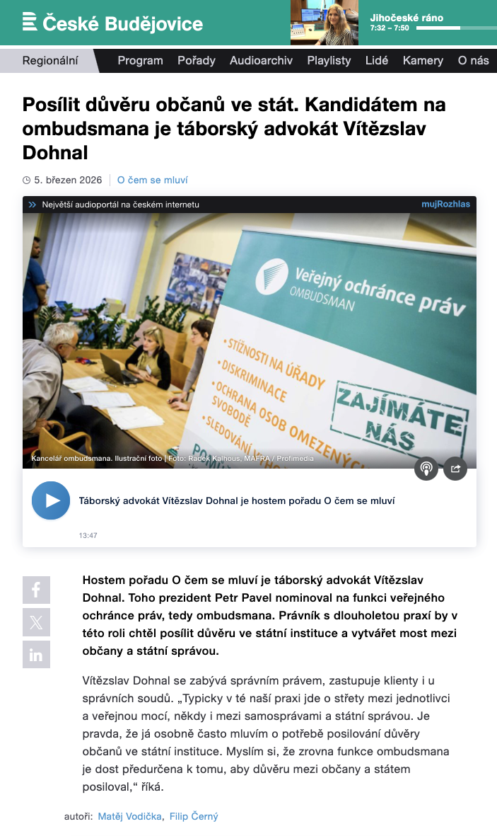 Nominace na ombudsmana: Rozhovor pro Český rozhlas