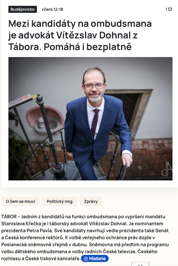 "Vnímám, že favoritem volby nejsem, ale nominace mě velmi potěšila," konstatoval pro JčTEĎ Vítězslav Dohnal. Hrad nominace prezidenta komentoval slovy, že Petr Pavel navrhuje osobnosti, jejichž morální vlastnosti a rozsáhlé znalosti a profesní zkušenosti v oblasti ochrany základních lidských práv a svobod zaručují řádný výkon funkce. Jihočeský nominant Vítězslav Dohnal z táborské advokátní kanceláře Dohnal & Bernard je držitelem titulu Právník roku v oblasti pro bono za bezplatné poskytování právní pomoci. V advokátní praxi je od roku 2008.